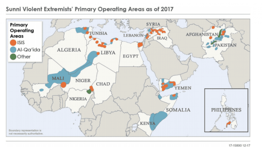 A map produced by the ODNI underscores the global nature of the threat. Outside of Iraq and Syria, ISIS fighters continue to wage insurgencies in several countries. And some of these branches of the so-called caliphate still threaten the United States and its allies.