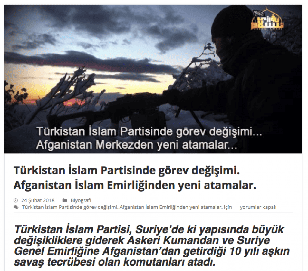 Doğu Türkistan Bülteni, a Turkish-language website that regularly reports on the TIP’s activities and disseminates the group’s propaganda, reported on Feb. 24 that new TIP leaders had arrived in Syria. Each of the jihadists – identified as Abu Omar al-Turkistani* and Abu Muhammad al-Turkistani – have “more than 10 years” of experience fighting in Afghanistan as part of the Taliban’s insurgency.