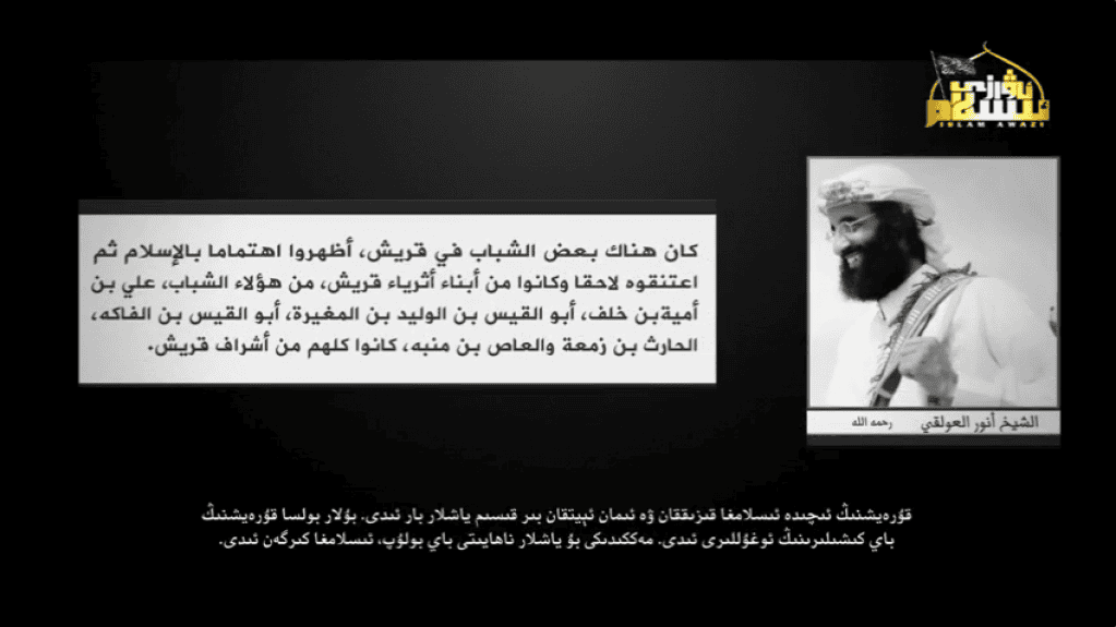 The TIP’s use of a clip of Anwar al-Awlaki is especially significant, as the AQAP ideologue was the most influential English-speaking jihadist in al Qaeda’s network at the time of his death in 2011. And his lectures remain powerful enticements to jihad to this day. In the clip selected by the TIP’s propagandists, al-Awlaki recounted a story from early Islamic history that is meant to serve as a warning for those who do not fully embrace the jihadist life.